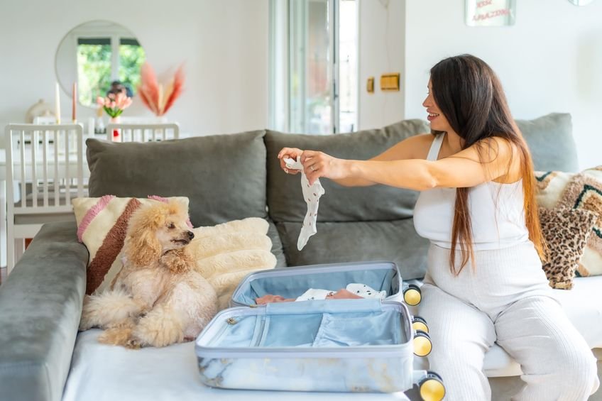 Un instant de tendresse et de préparation : une future maman partage un moment complice avec son chien, tout en organisant les affaires de son bébé. Une image qui illustre l’excitation et la douceur des derniers préparatifs avant une nouvelle aventure familiale.