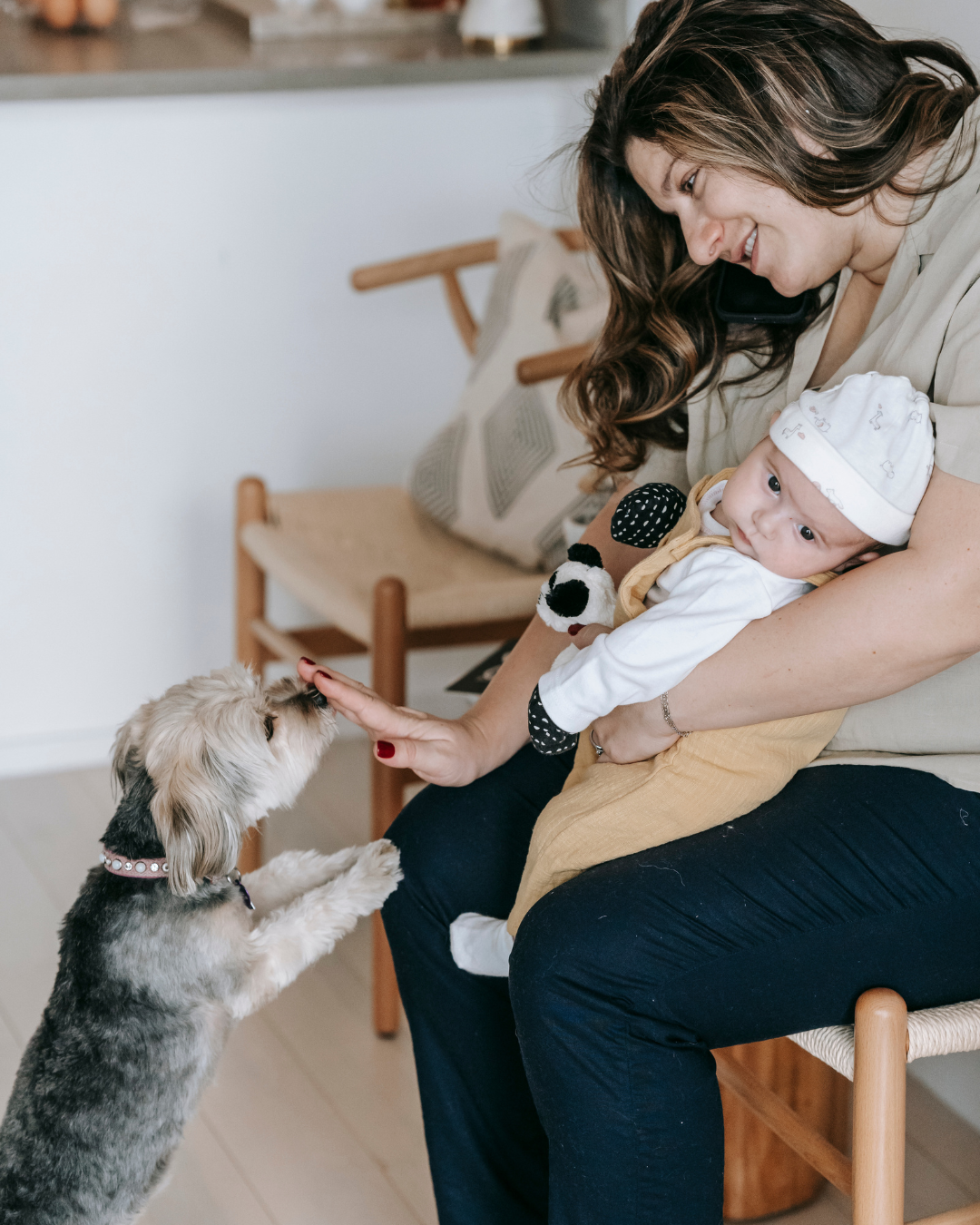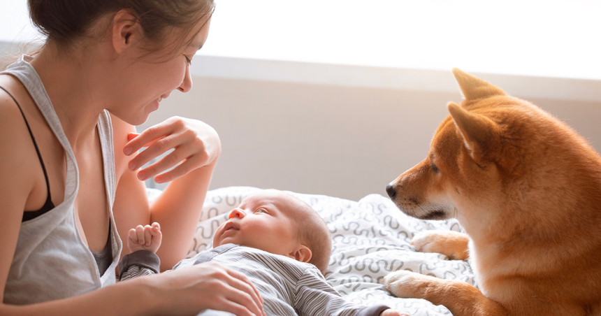 Un moment de douceur partagé entre une mère et son nouveau-né, sous le regard attentif et bienveillant de leur chien. Un témoin silencieux de ces instants précieux